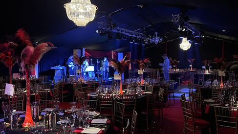 A framed marquee provided the perfect structure for this ambitious New Year’s Eve celebration. Lined in deep, dark tones, the interior created a striking backdrop for rich red drapes, chandeliers and theatrical lighting. The space was transformed into an atmospheric venue that echoed the grandeur of the stage, while still offering comfort and flow for guests throughout the evening.