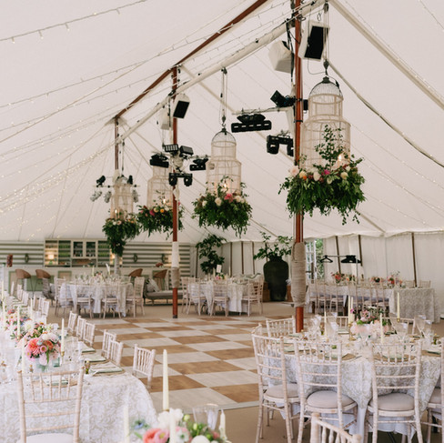 Suspended from the marquee ceiling were ornate birdcages filled with greenery and flowers, surrounded by a canopy of delicate pea lights. As daylight faded, the soft glow of the lighting created a romantic atmosphere, highlighting the height and craftsmanship of the traditional pole structure.